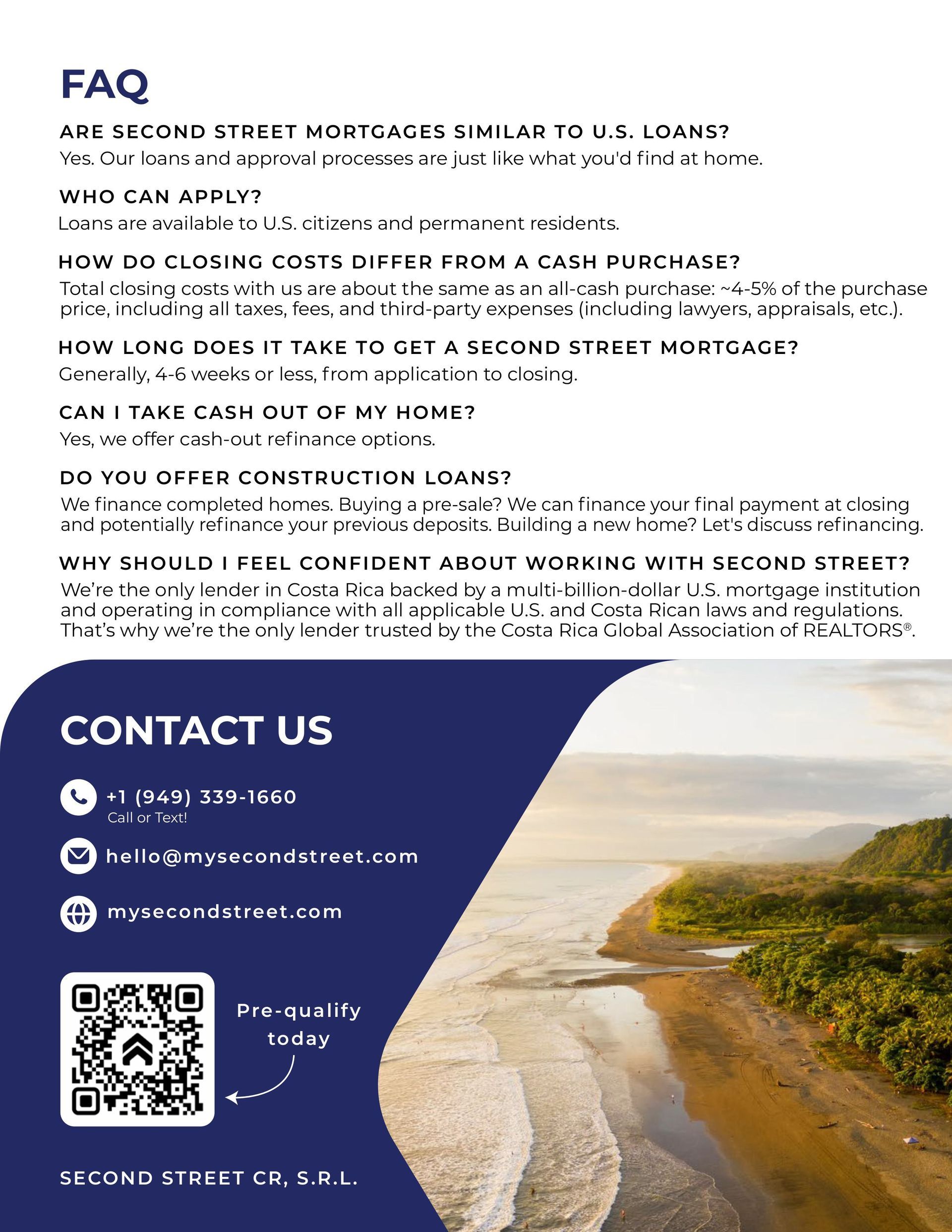Costa Rica offers a unique blend of natural beauty, vibrant culture, and a welcoming community. With favorable property laws for foreign buyers and a range of investment opportunities, it's an ideal location for your next home.Can I get pre-approved for a mortgage?